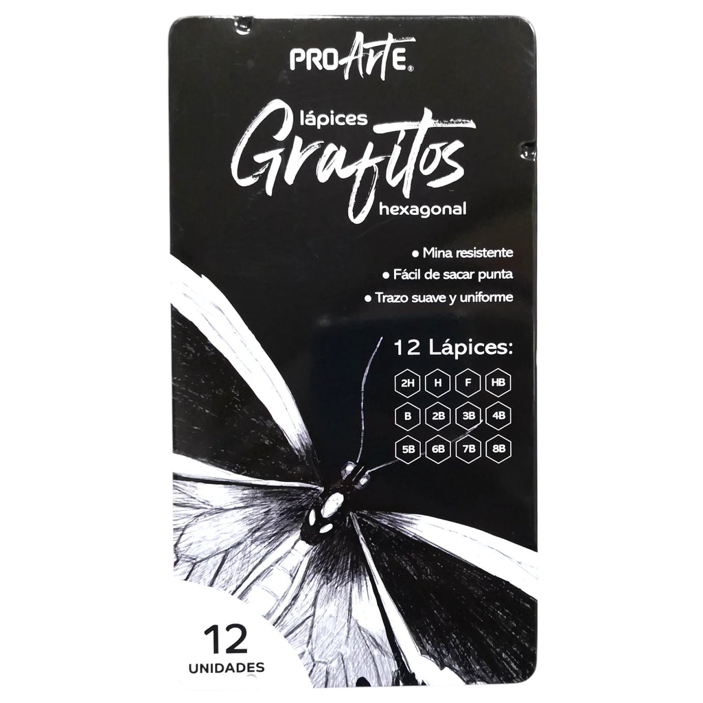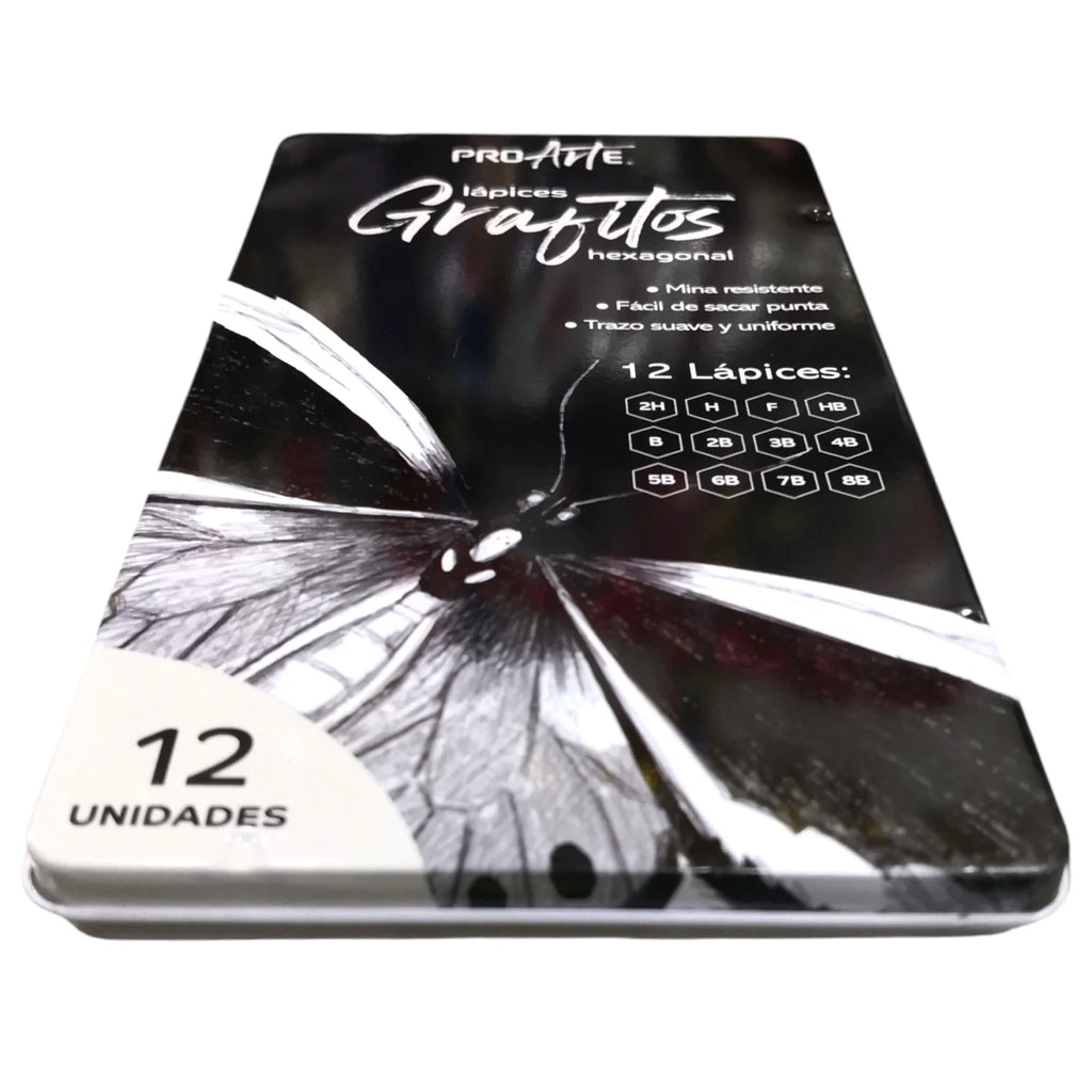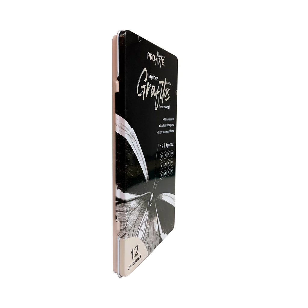 La caja de lata contiene 12 lápices grafito de dibujo técnico Proarte, es el set ideal para estudiantes, dibujantes y quienes buscan precisión en sus trazos.