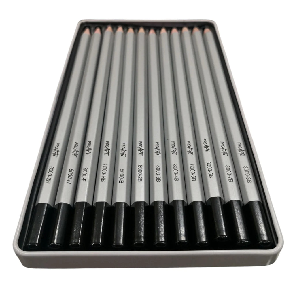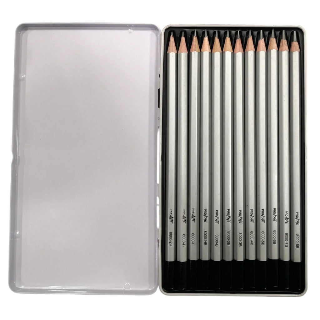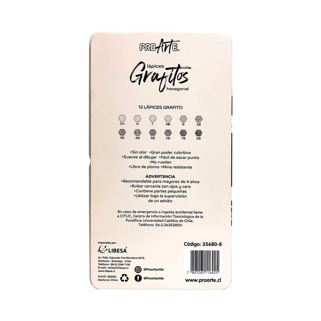 La caja de lata contiene 12 lápices grafito de dibujo técnico Proarte, es el set ideal para estudiantes, dibujantes y quienes buscan precisión en sus trazos.