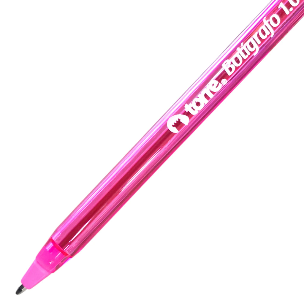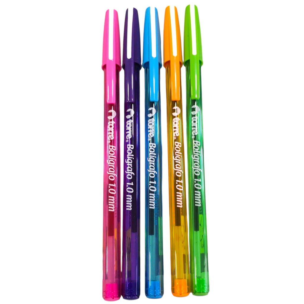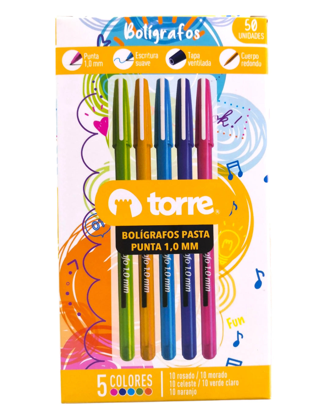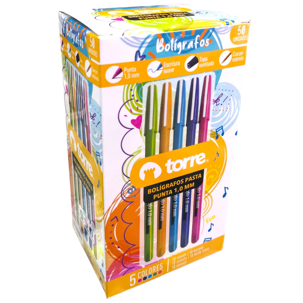La caja de 50 lápices pasta de colores surtidos Torre es la opción perfecta para escuelas, oficinas y uso diario. Incluye 50 lápices pasta en colores celeste, morado, rosado, verde y naranja, todos con punta de 1.0 mm, ideal para escribir con suavidad.