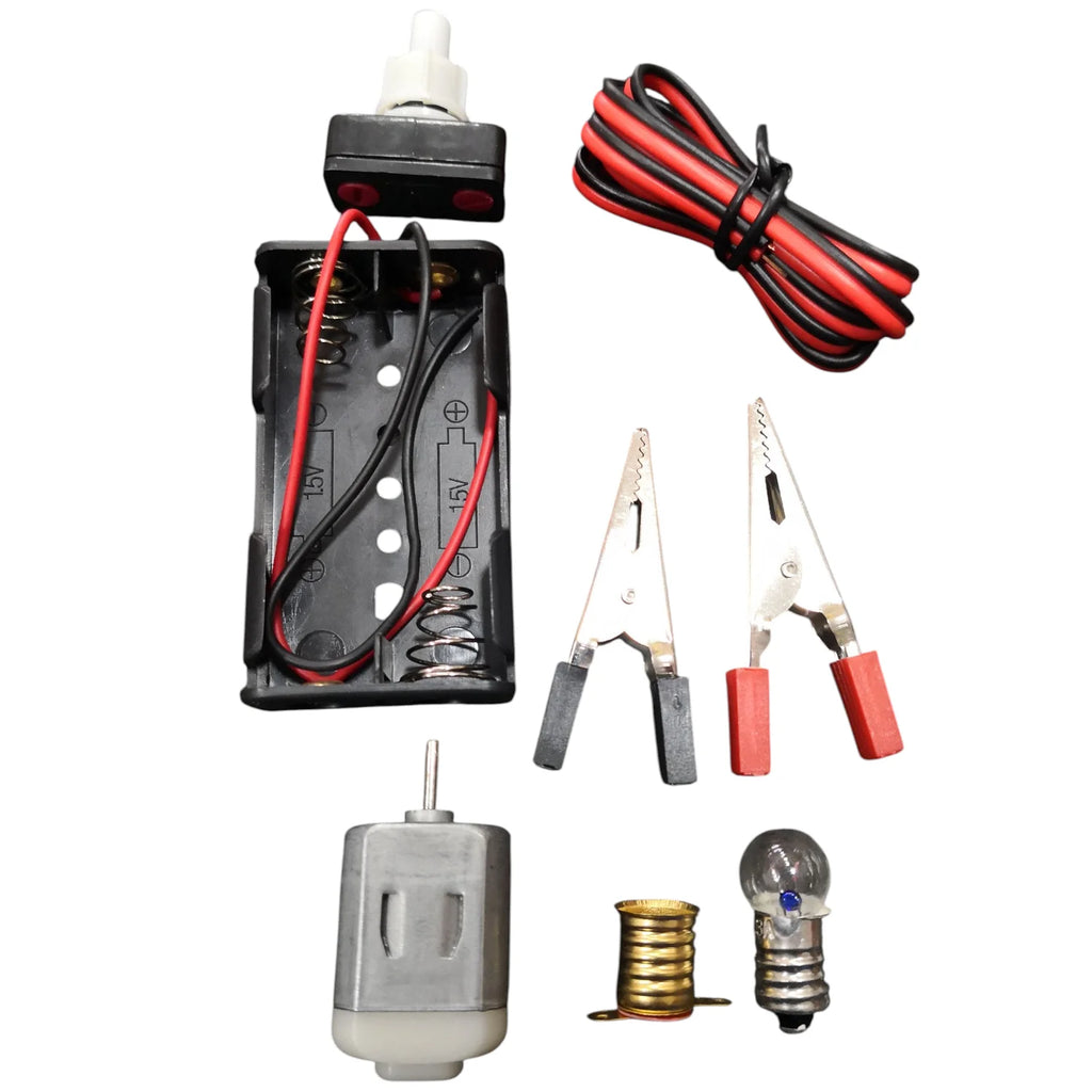 Este kit incluye todos los elementos esenciales para armar circuitos funcionales: interruptor, ampolleta, soquete, motor, portapilas, pinzas y cables. Su uso es perfecto para clases de ciencias, ferias científicas, trabajos grupales y actividades STEM.