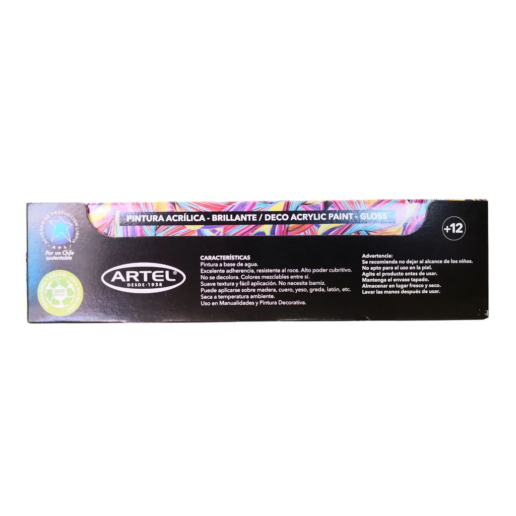 Pintura Acrílica de acabado brillante Artel. Extrema adherencia sobre todo tipo de superficies (Madera, yeso, metal, greda, papel maché, vidrio, latón, bizcocho, cuero, plástico, cartón, muros, etc.) Excelente poder cubriente, no se decolora. Colores mezclables entre sí.